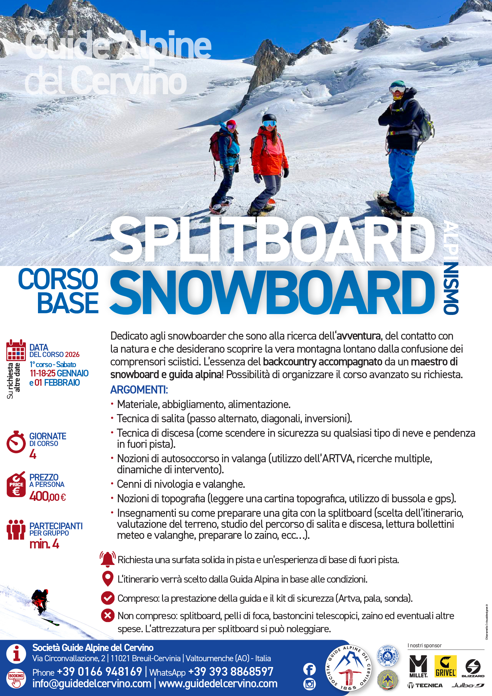 Dedicato agli snowboarder che sono alla ricerca dell'avventura, del contatto con la natura e che desiderano scoprire la vera montagna lontano dalla confusione dei comprensori sciistici. L'essenza del backcountry accompagnato da un maestro di snowboard e guida alpina! Possibilità di organizzare il corso avanzato su richiesta